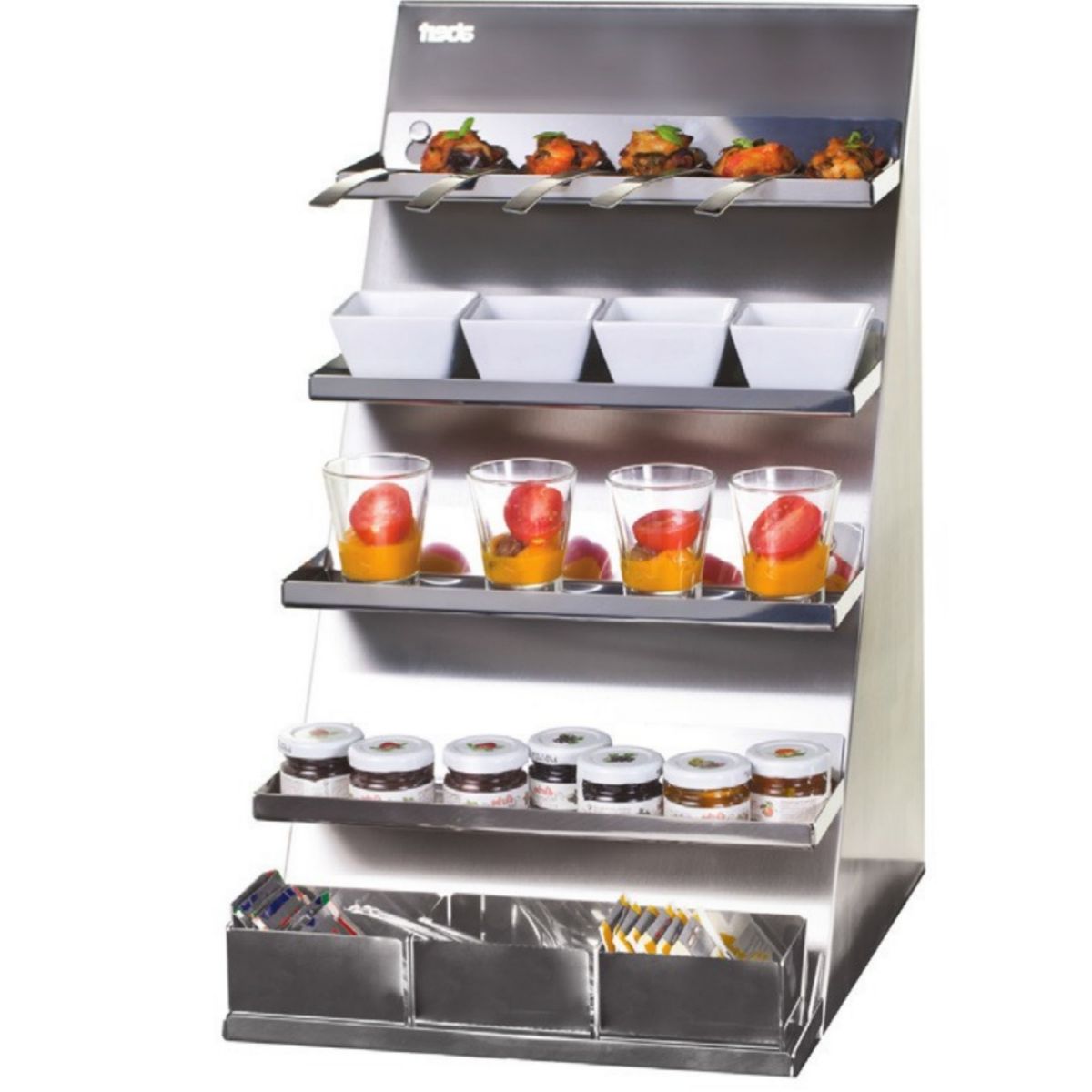 Rozměr: 295 x 365 mm, výška: 500 mm. Nerezové provedení. Obsahuje5 nerezových poliček a 3 nerezové misky. Bufetové stojany a etažéry jsou vhodné například na müsli, medy, oříšky, suché plody a ovoce. Nabízí elegantní řesení jak na relativně malém místě um