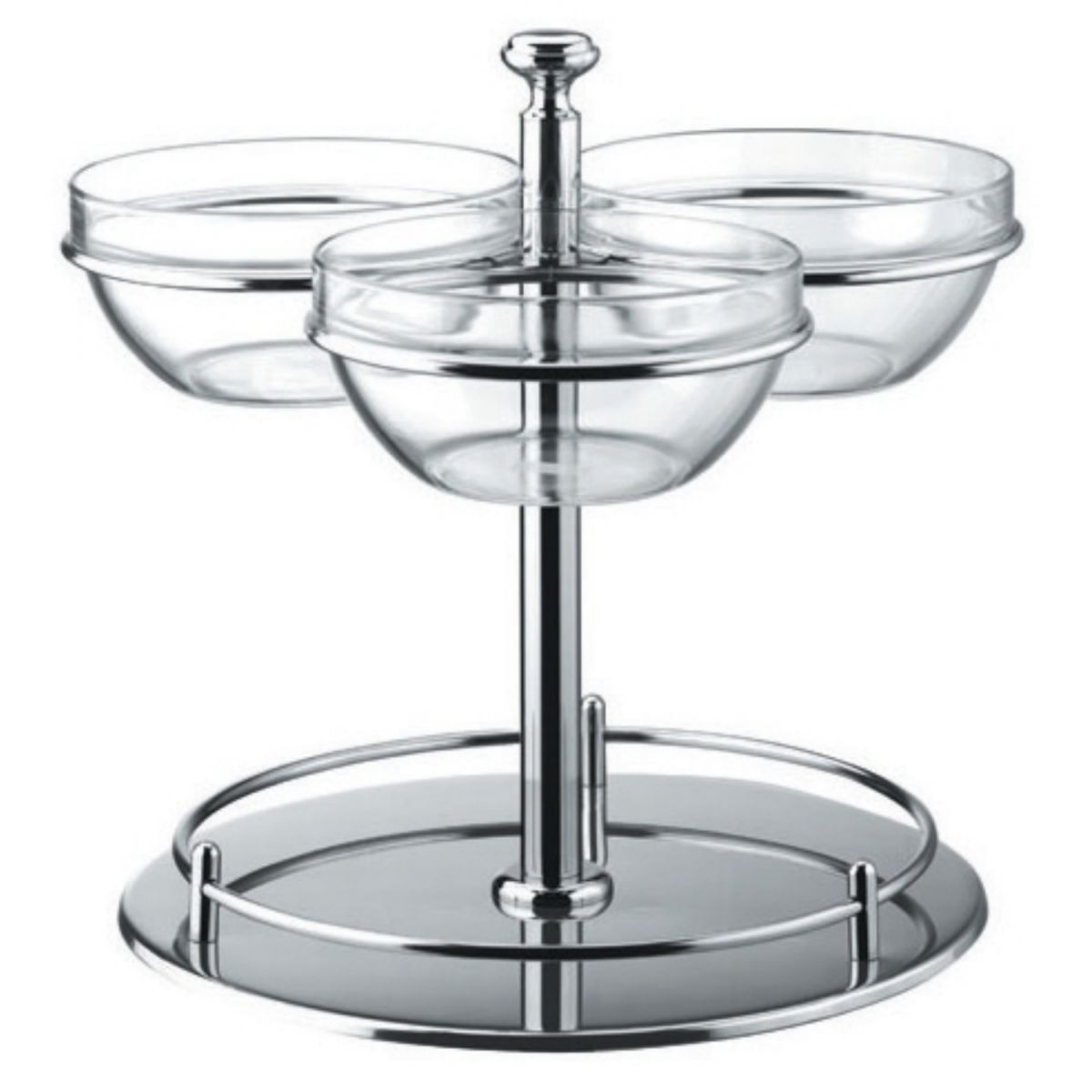 Průměr: 420 mm. Nerezové provedení. Patro s miskami otočné. Průměr skleněných misek 23 cm. Bufetové stojany a etažéry jsou vhodné například na müsli, medy, oříšky, suché plody a ovoce. Nabízí elegantní řesení jak na relativně malém místě umístit více prod